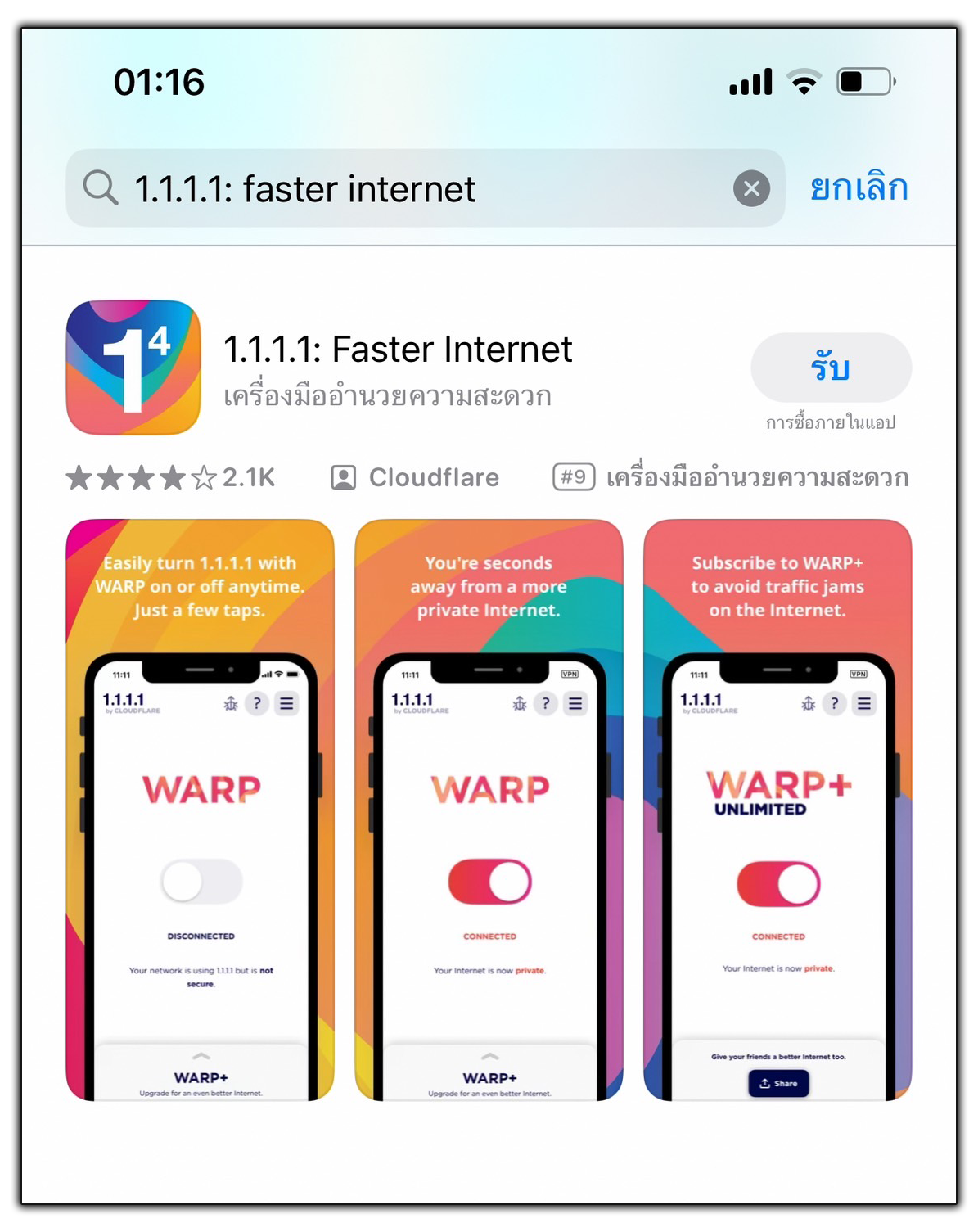 1. ไปที่ App Store แล้วดาวน์โหลดแอป ชื่อ 1.1.1.1: Faster Internet