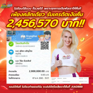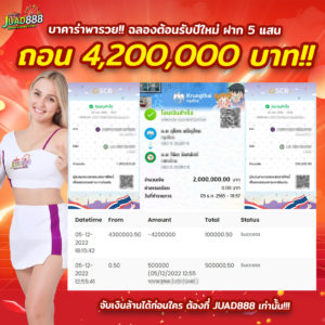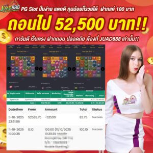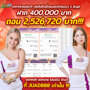 JUAD888 เว็ปคาสิโนอันดับ 1 มีทุนน้อยแต่อยากได้เงินล้าน  ฝากหลักร้อยถอนหลักล้าน ที่อื่นไม่จ่ายแต่เราจ่าย ถอนได้ไม่จำกัดจำนวนครั้ง ทั้งวันทุกวันตลอด 24 ชั่วโมง  ด้วยระบบฝาก-ถอนที่ทันสมัยรองรับทุกธนาคาร อนฟรี! ไม่มีค่าธรรมเนียม  สามารถทำรายการถอนได้ด้วยตัวเอง เพียง 5 นาที